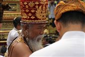 A Balinese Buddhist holy man blessing a mourner at a royal family Ngaben or cremation ceremony in Ubud, Bali.